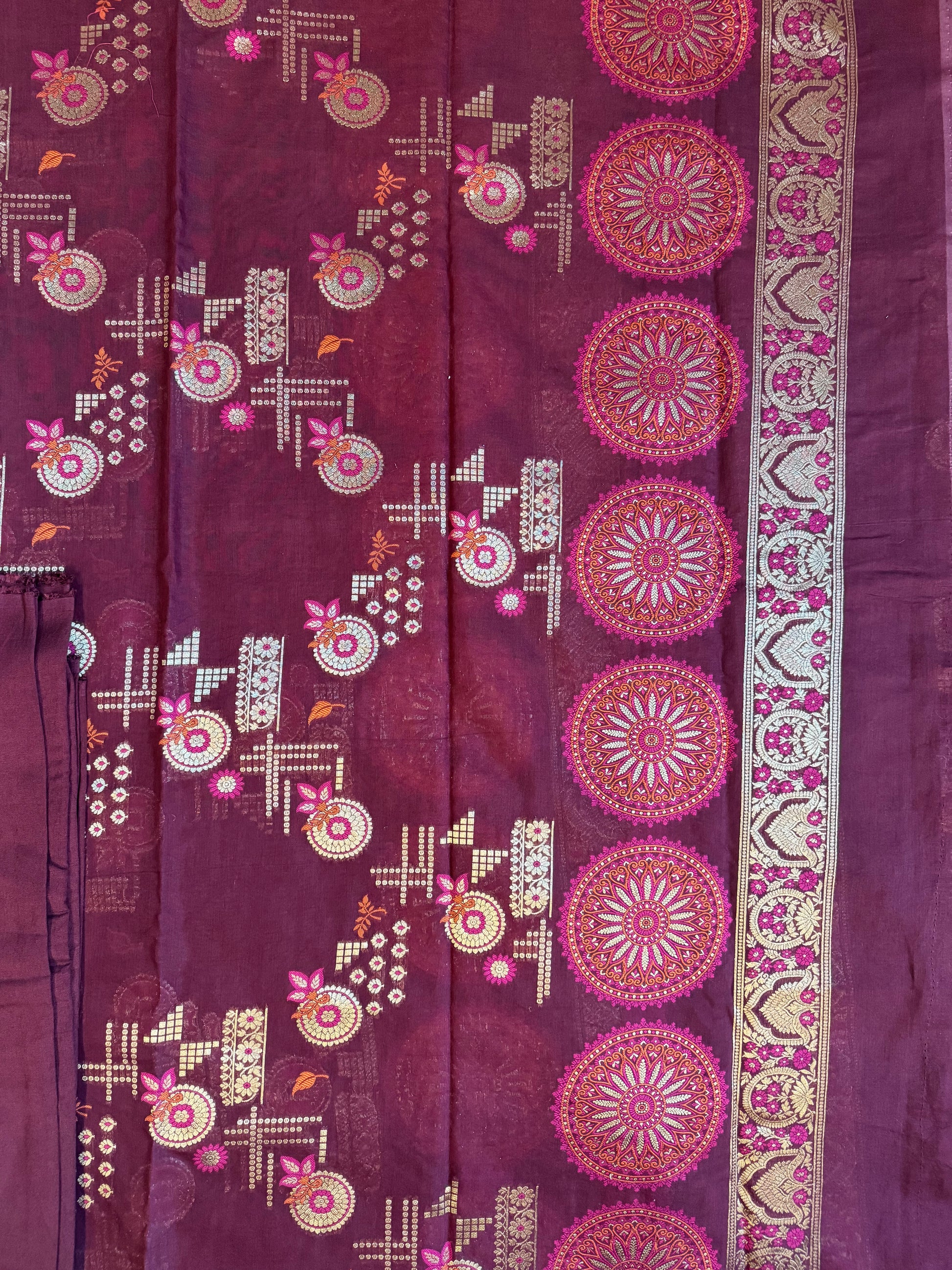A pure mul cotton Banarasi suit set woven with zari and resham, featuring a rich jewel-toned base detailed with circular and geometric bootis all over. The kurta’s layout feels ornate yet balanced, while the border showcases bold mandala-style motifs paired with fine floral weaving for that classic Banarasi grandeur. The matching dupatta mirrors the same artistry, keeping the whole set cohesive, lightweight, and beautifully festive. Soft, breathable mul cotton meets the shimmer of Banarasi craft, comfort wrapped in quiet opulence.