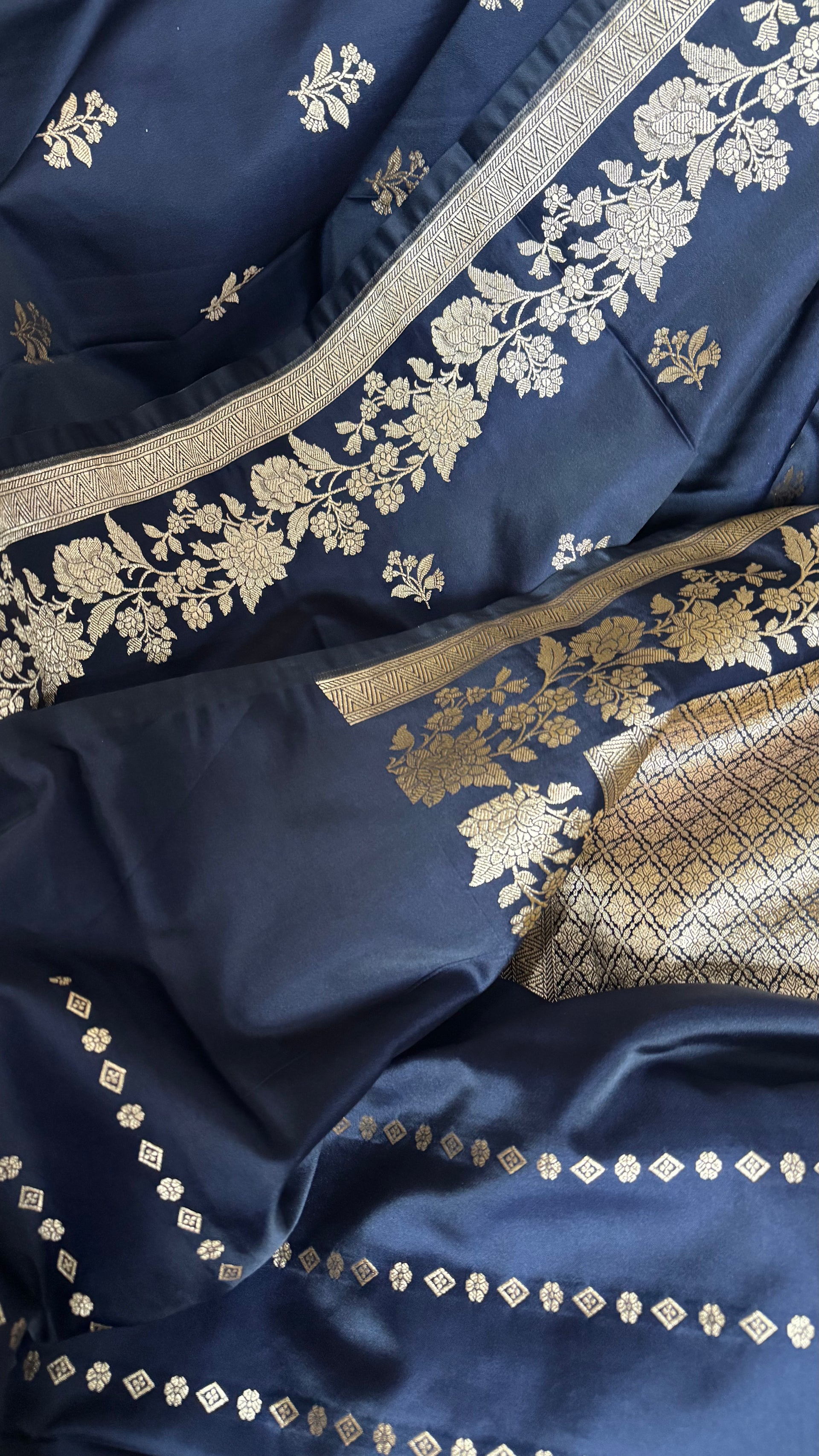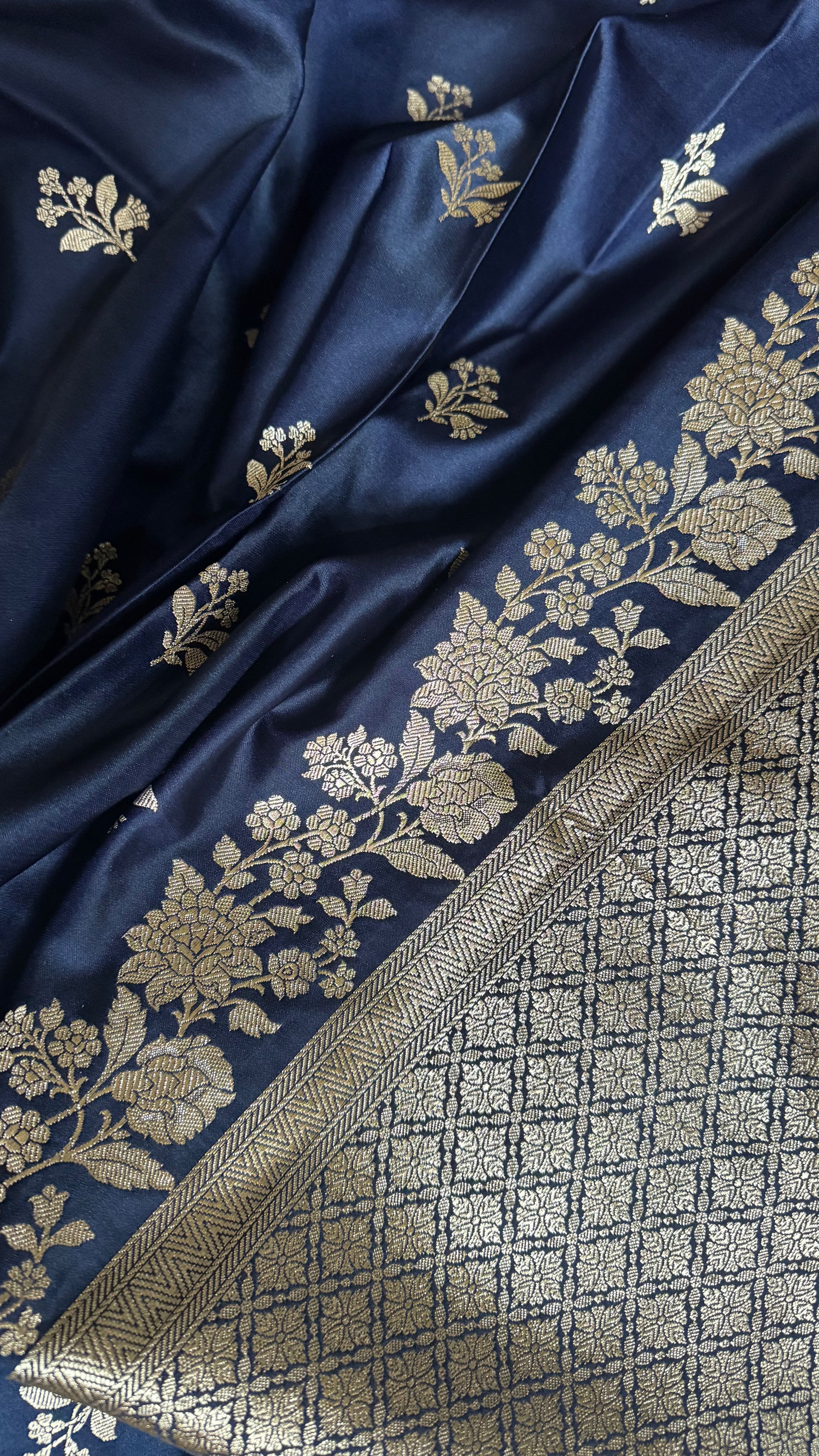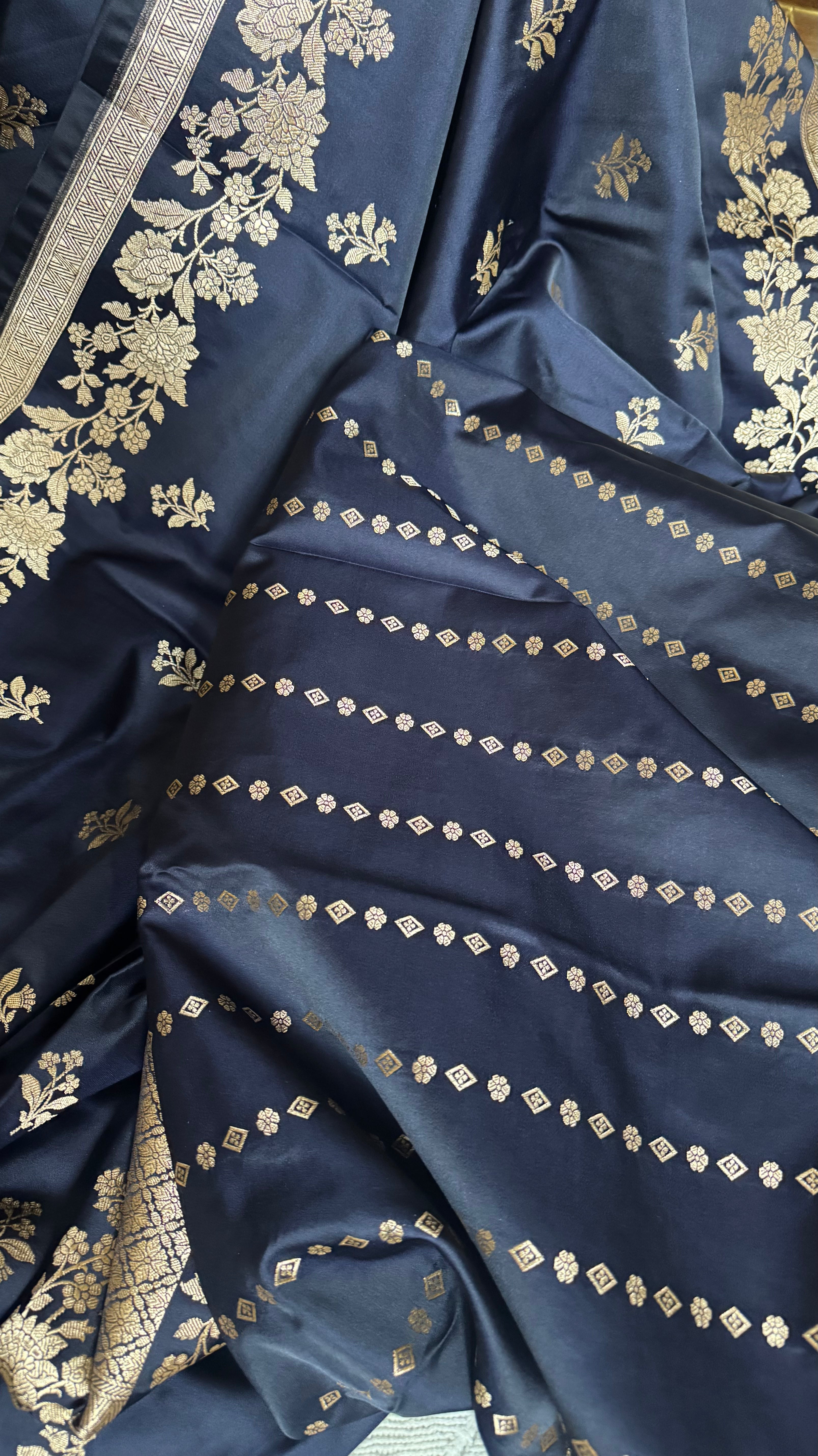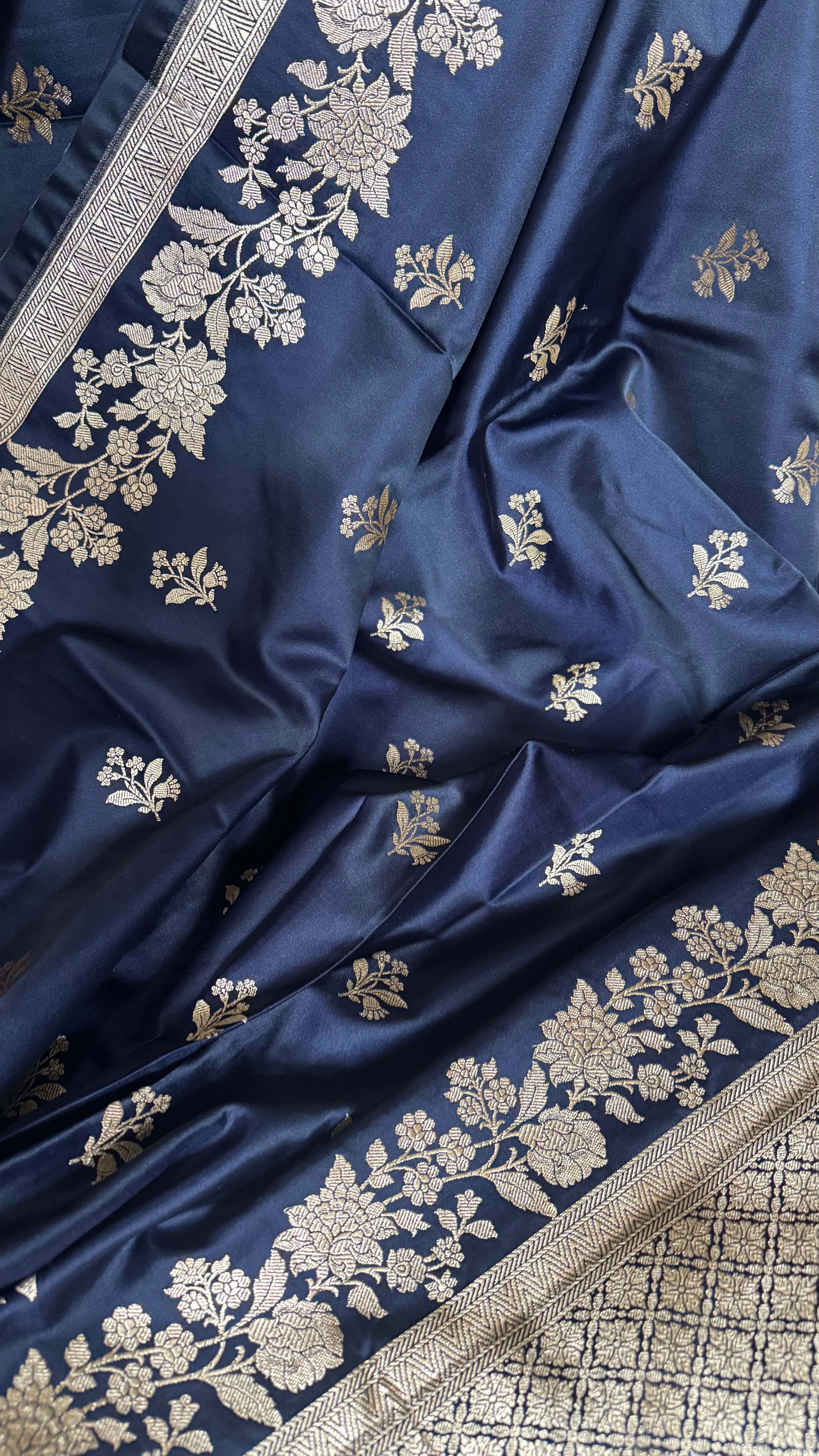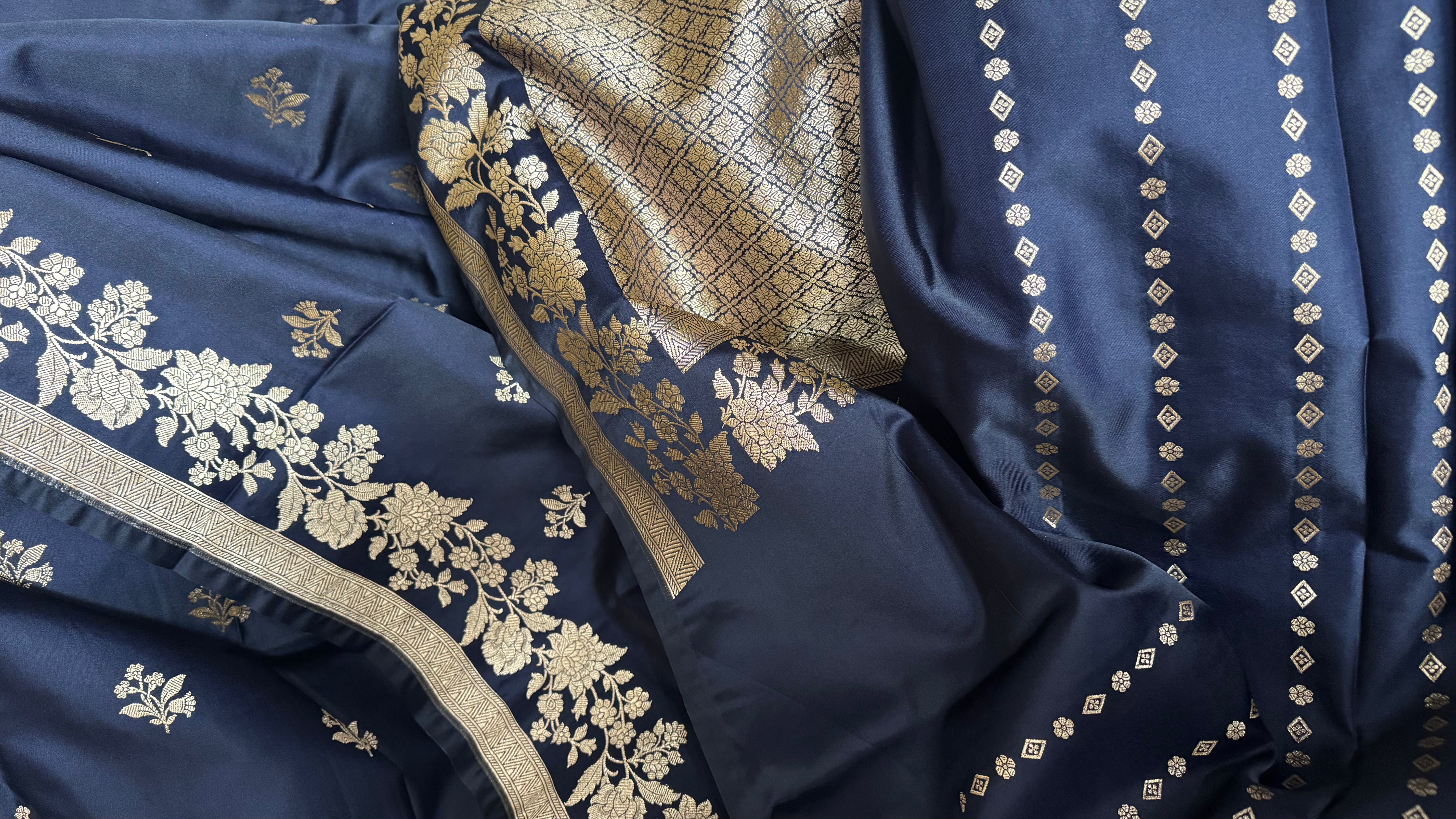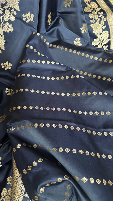 This navy blue Mashru Katan Banarasi saree is a beautiful expression of depth, detail, and refined craftsmanship. The Mashru Katan fabric gives the saree its distinctive character, a subtle sheen with a structured yet graceful fall that feels rich and composed.