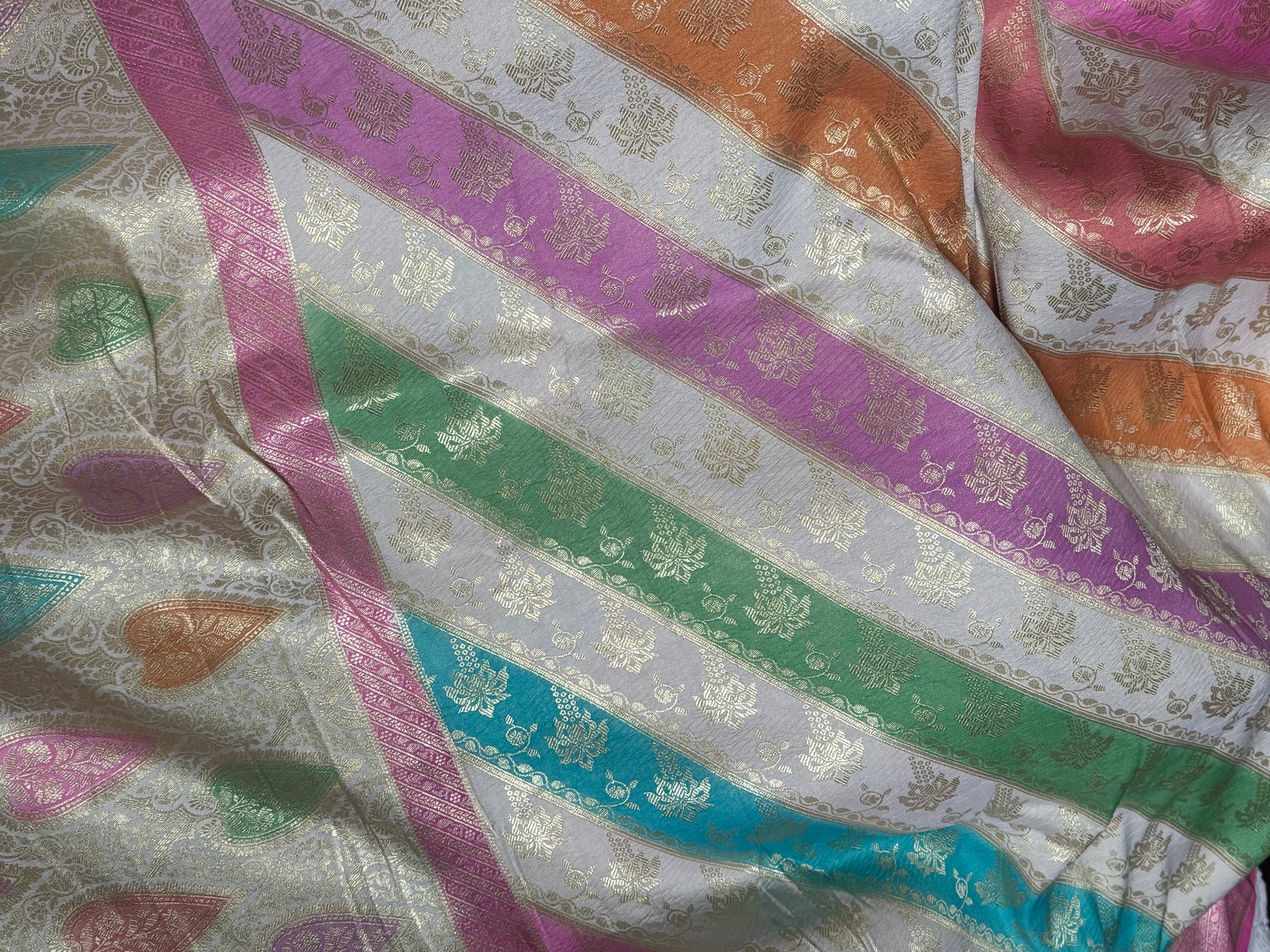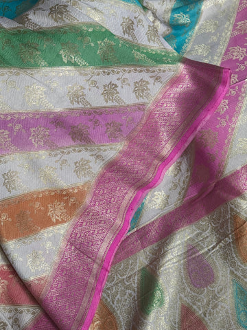 This pure mulberry silk Tanchoi saree is a rare celebration of colour, precision, and refined craftsmanship. Set on an elegant off white base, the saree becomes a perfect canvas for the rainbow striped weave that runs across it, vibrant yet balanced, striking yet graceful. Each colour stands out crisply against the soft white, creating a luminous, joyful rhythm across the fabric.