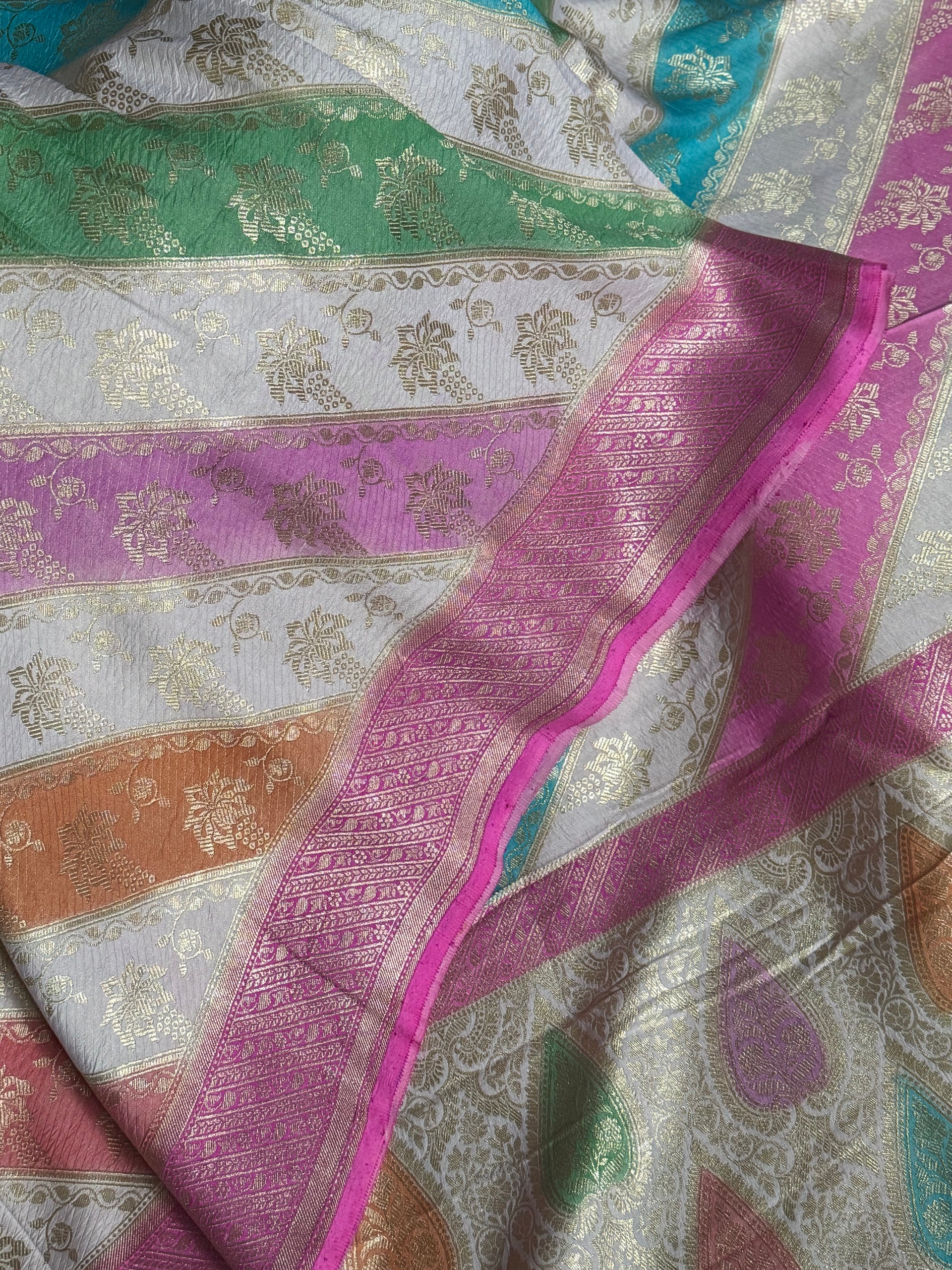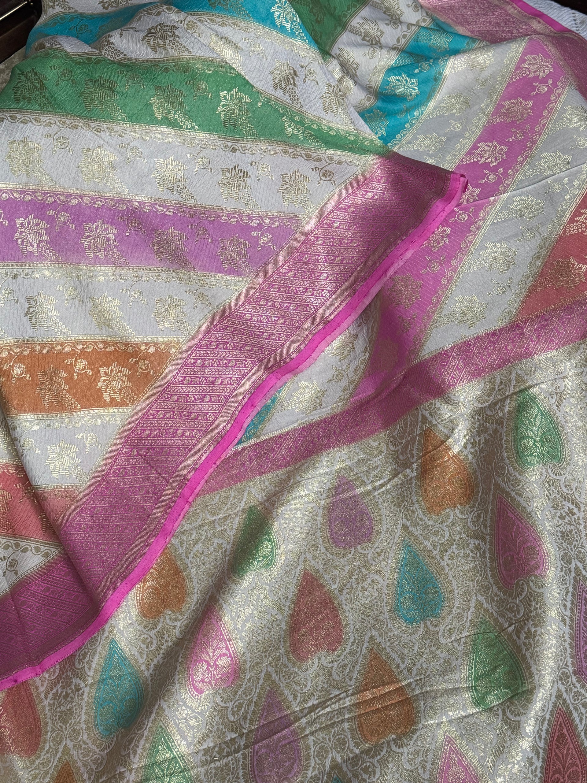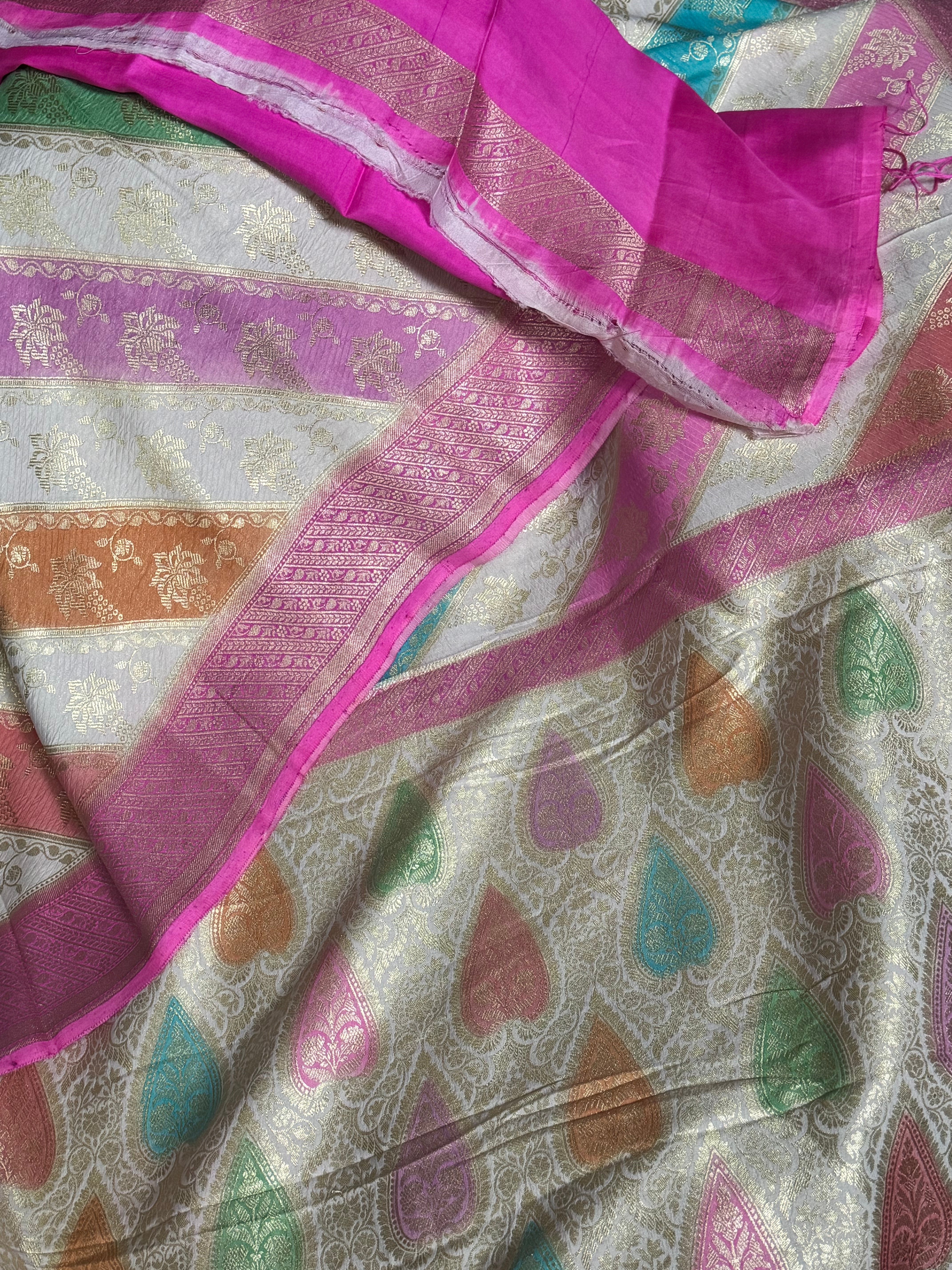 A bold yet refined border in a fuchsia pink and candy pink tone frames the saree beautifully, adding contrast and warmth. The pallu carries multicolour motifs that echo the rainbow theme, making the design feel complete and thoughtfully composed rather than decorative for effect.