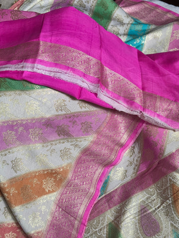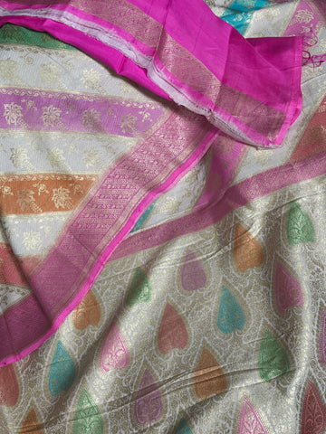 Off White Pure Mulberry Silk Tanchoi Saree with Rainbow Stripes and Fuchsia Pink Accents