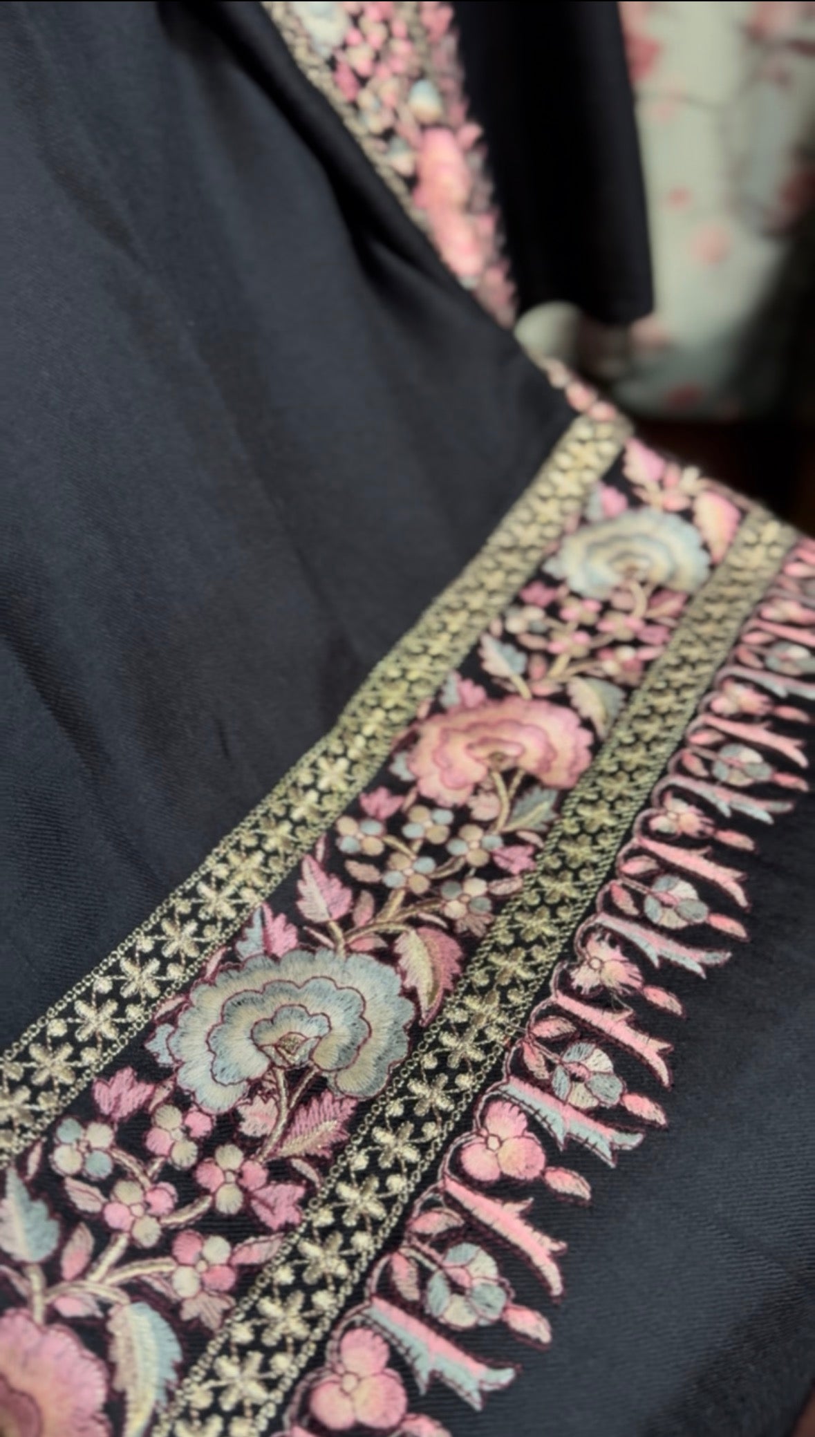 The border carries pastel florals and vines, each motif outlined with steady needlework. Achieving this level of uniformity on all sides takes time; the artisan works in a careful rhythm, matching colours and spacing so the pattern stays consistent. That’s why a good sozni shawl feels refined the moment you touch it, the work is slow, exact, and completely intentional.