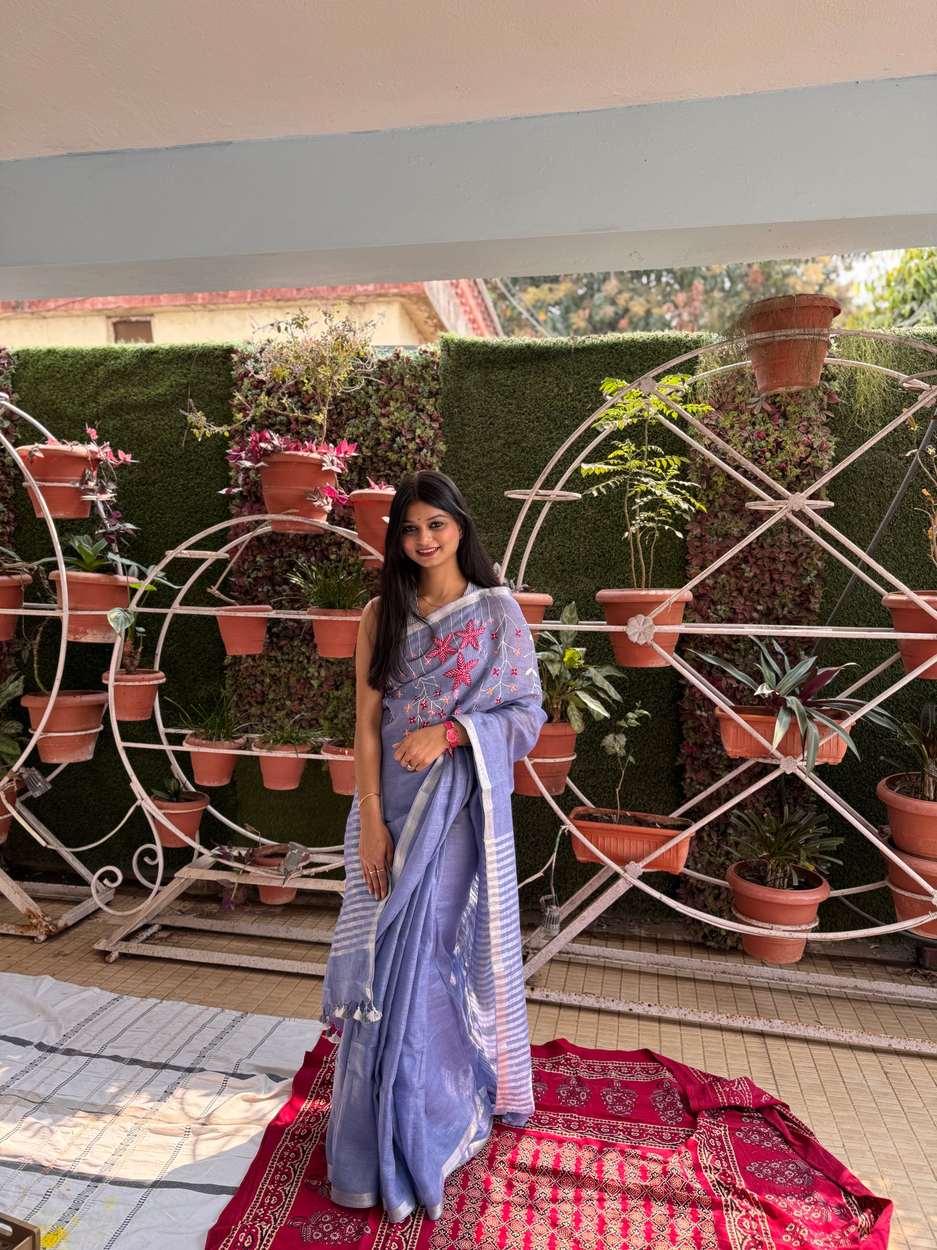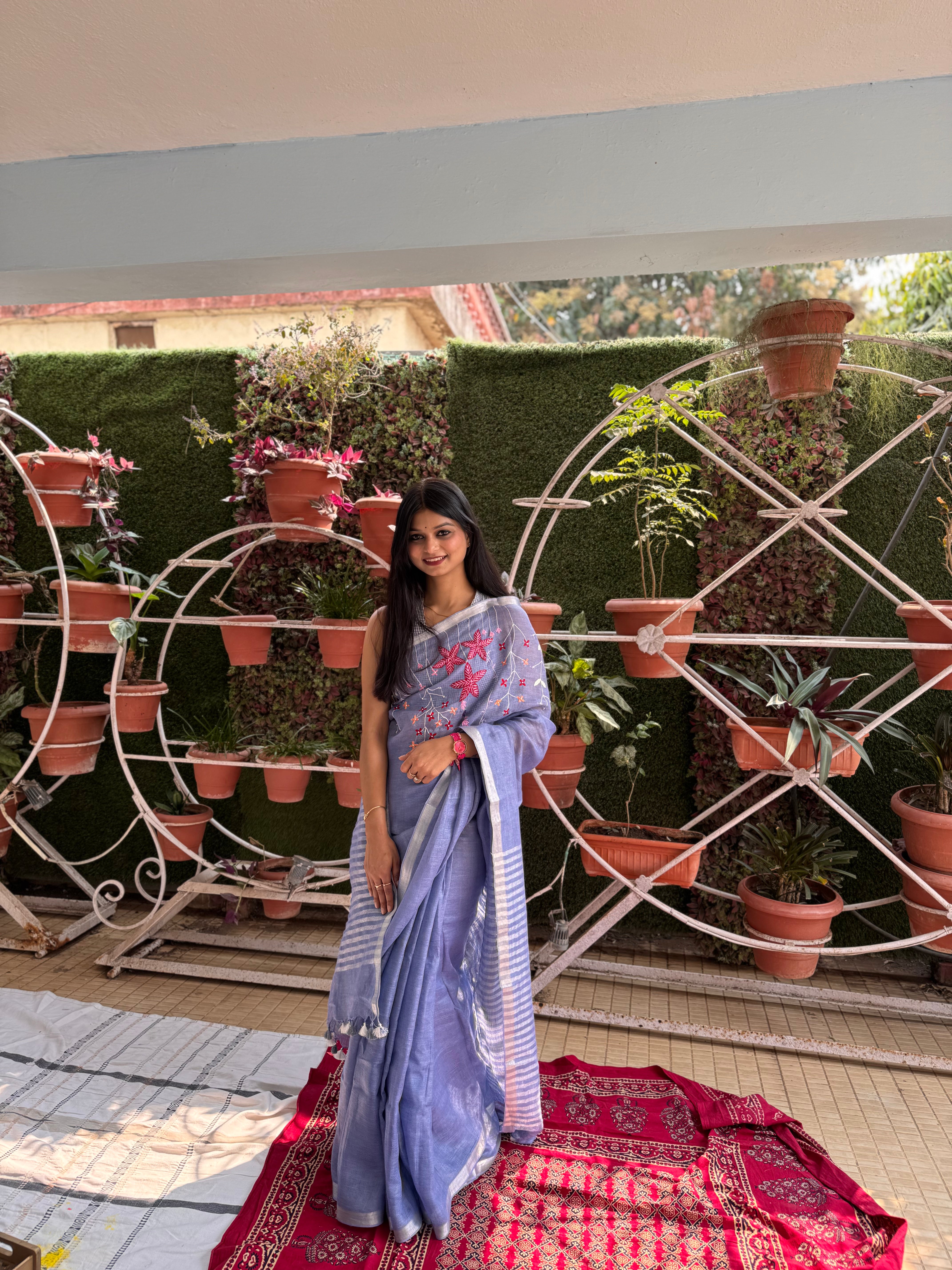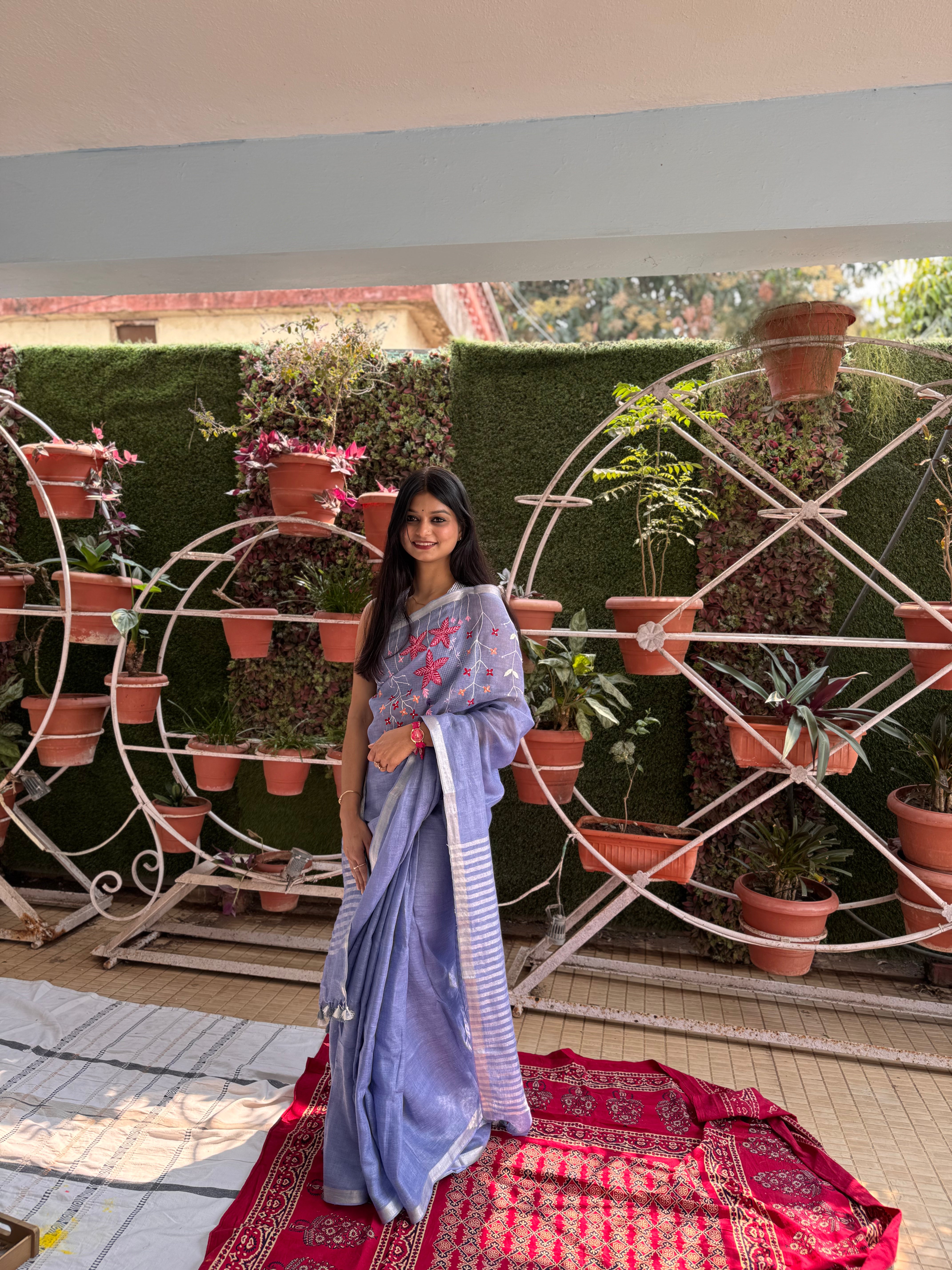 Crafted in breathable pure linen, this saree is perfect for summer dressing. Linen is naturally lightweight, airy, and moisture absorbent, helping you stay comfortable through warm days. Its crisp texture gives a polished silhouette for formal meetings, while the relaxed feel makes it equally suited for brunches and everyday wear.