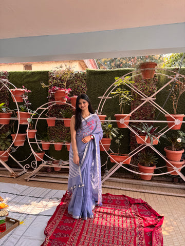 A distinctive smoky periwinkle pure linen saree that beautifully blends greyed blue with a soft hint of purple, creating a refined, in between tone that feels modern yet timeless. The shade is subtle but noticeable, making it easy to style for both day and evening.