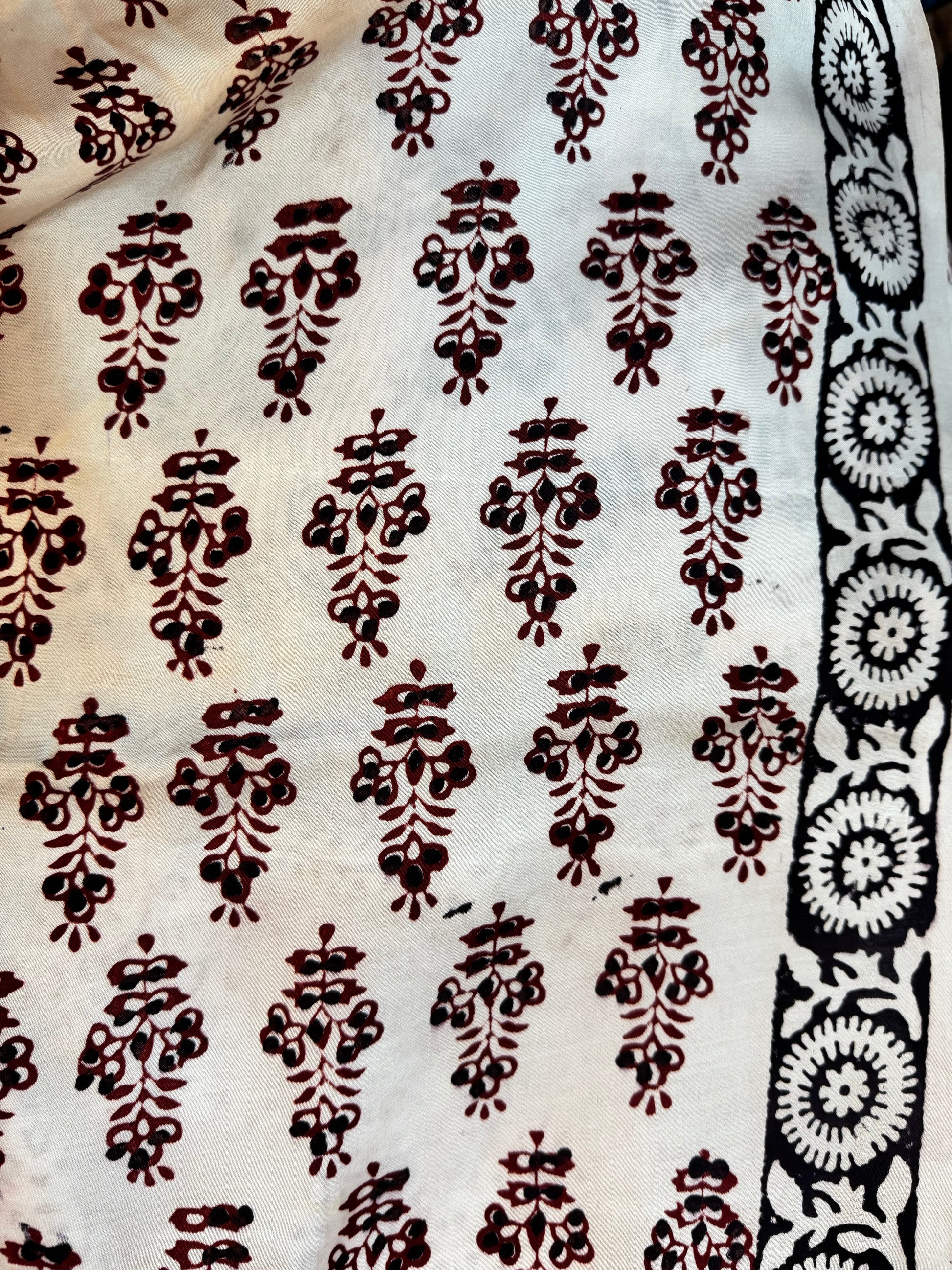 This three piece suit is crafted in soft modal silk, finished in a classic white base that lets the Bagru hand block print take centre stage. The print is done in traditional black and red, giving it that unmistakable earthy Bagru character that feels timeless yet easy to wear.