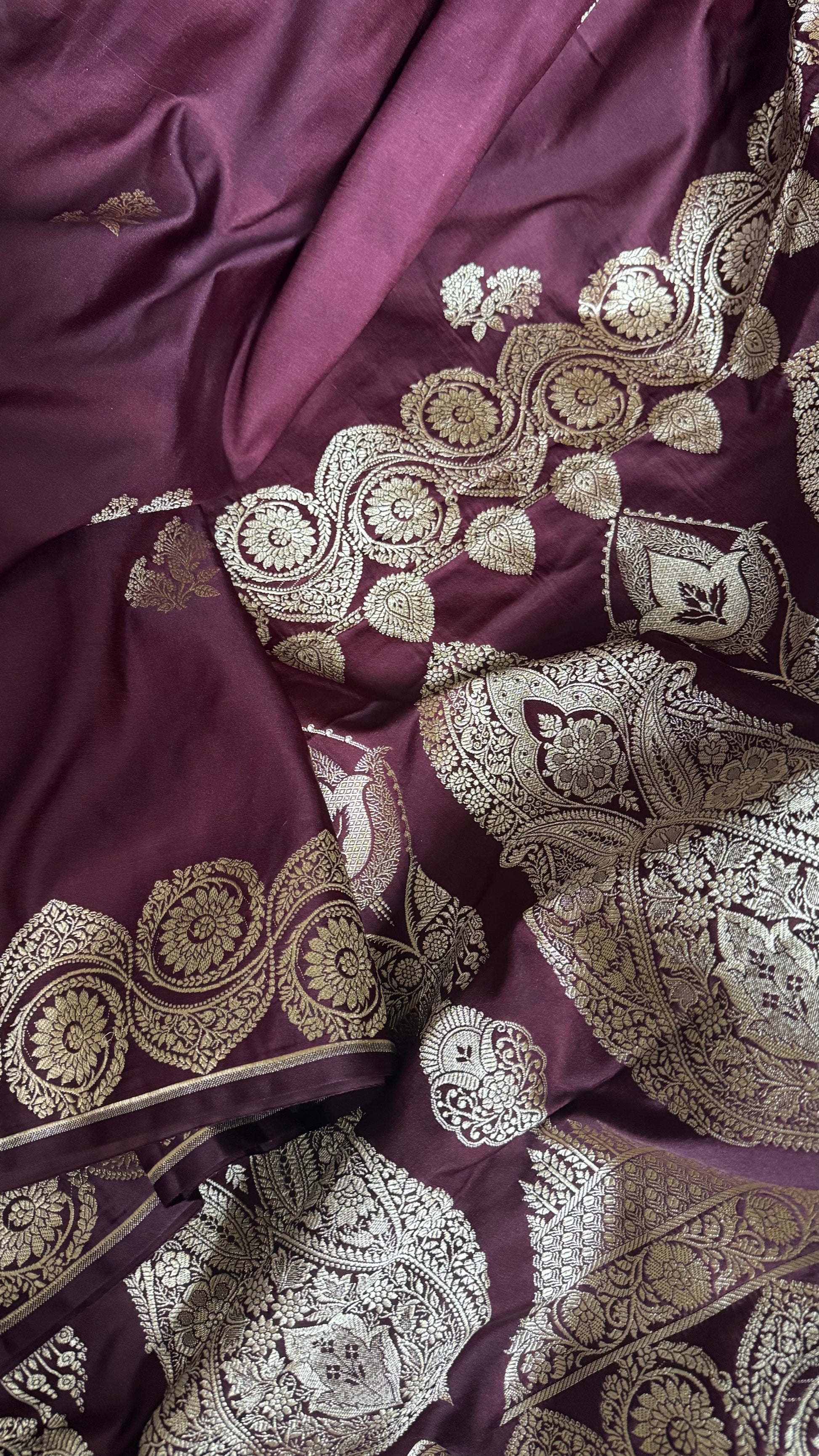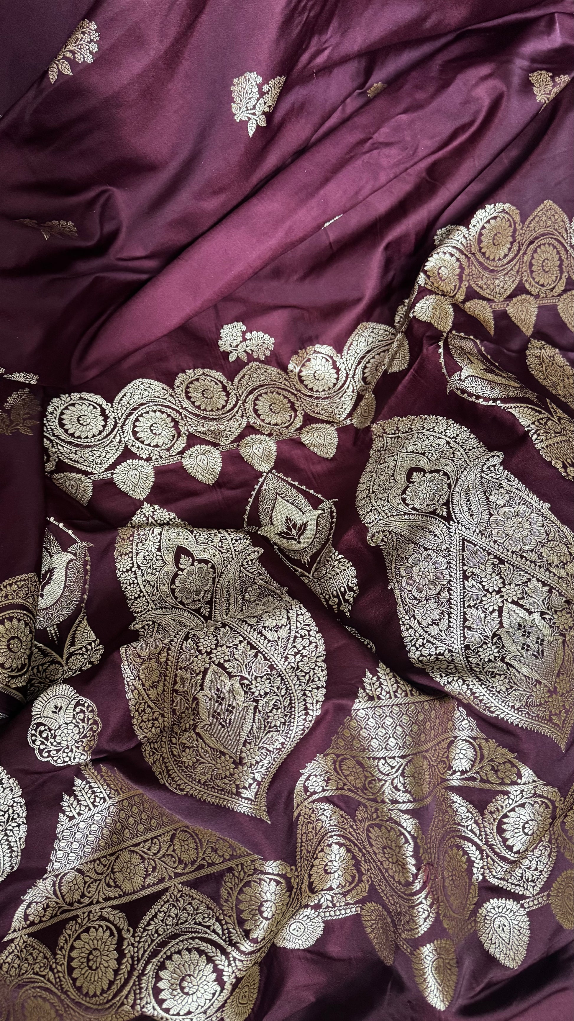 This wine coloured pure Mashru Katan Zari Banarasi saree is a statement of refined luxury and thoughtful design. The deep wine base feels rich and mature, setting the perfect backdrop for the warmth of rose gold zari, a choice that immediately elevates the saree beyond the expected.
